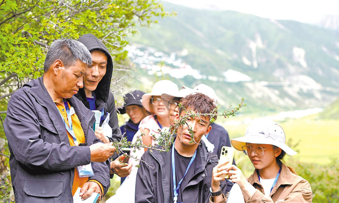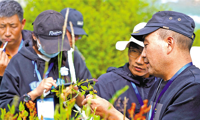 圖為藏醫專家(右一)現場講解野生藥材辨認方法。