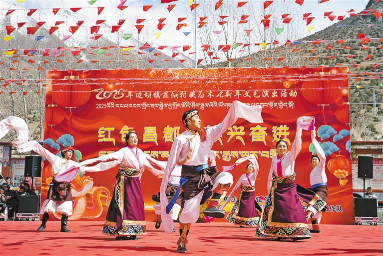 2月28日,全國“村晚”示范點昌都市邊壩縣顯俄村熱鬧非凡,一場以“紅色昌都·振興奮進”為主題的“村晚”文藝演出在此舉行,吸引了1000余名群眾觀看。活動現場,各族群眾身著盛裝,共同欣賞這場文化盛宴。演出人員用優美的舞姿、歡快的節奏,為觀眾帶來一場活力與激情四溢的視聽享受。