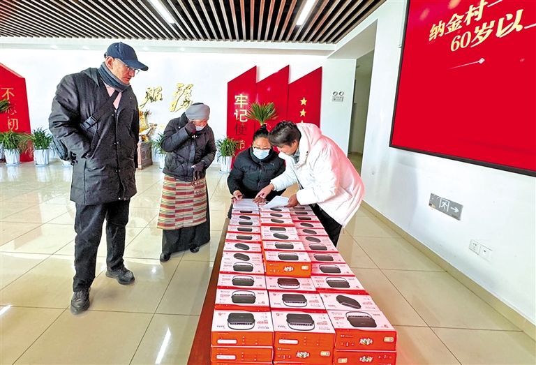 圖為納金村委會工作人員為轄區老人免費發放收音機。本網記者 格桑倫珠 攝
