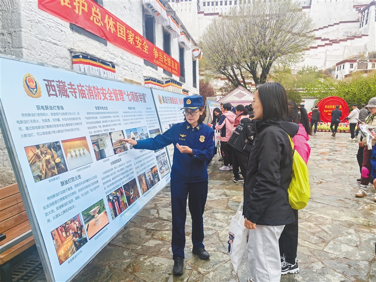 圖為布達(dá)拉宮消防救援大隊(duì)宣傳人員為群眾普及消防安全常識(shí)。