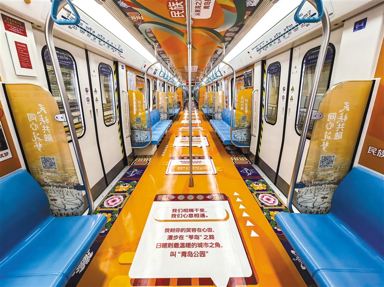 在青島地鐵“日喀則號”列車上,青島經濟職業學校西藏班學生丁增央珍感嘆:“在車廂里仿佛能觸摸到家鄉的雪山和青稞田,掃碼還能看到藏戲表演,既親切又震撼!”