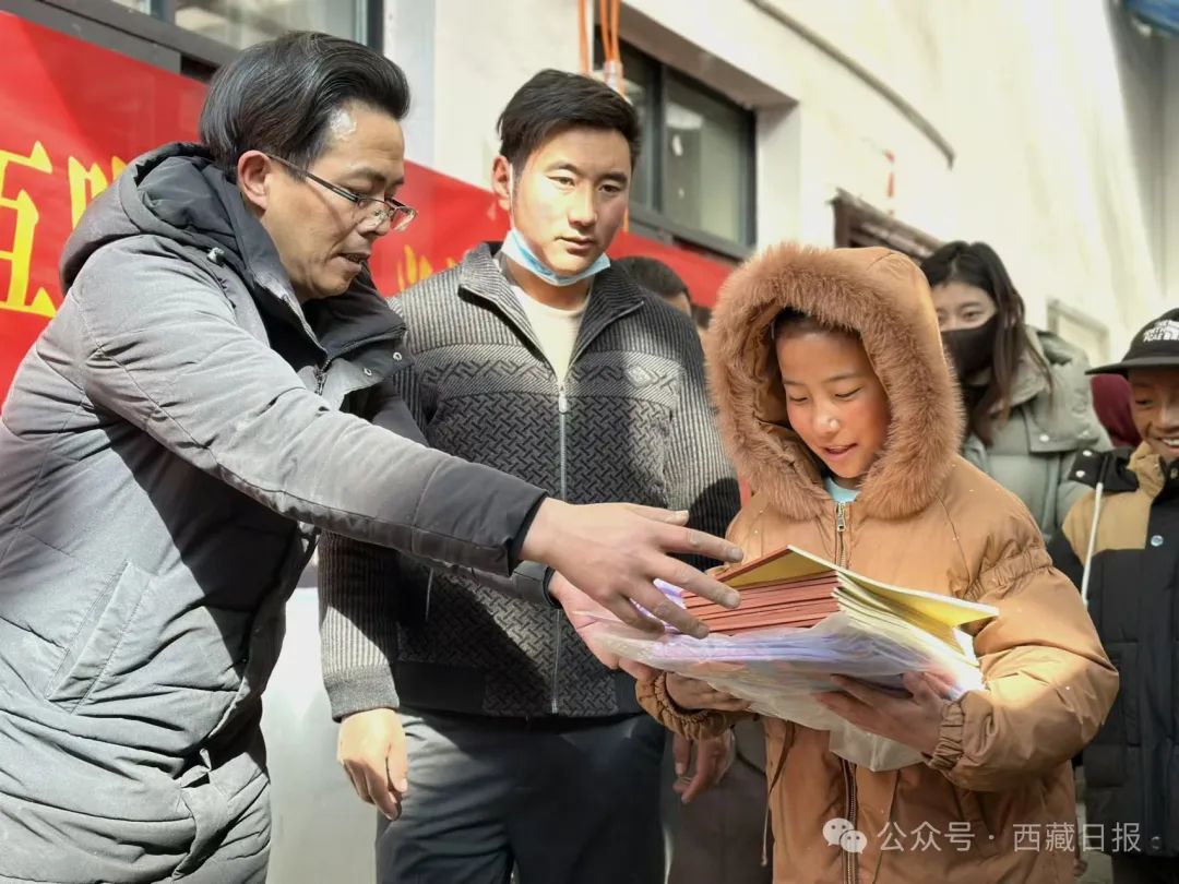 圖為那曲市嘉黎縣藏比鄉(xiāng)美巴爾村駐村工作隊(duì)員正為學(xué)生發(fā)放學(xué)習(xí)用品。記者 曲珍 通訊員 衡猛 攝