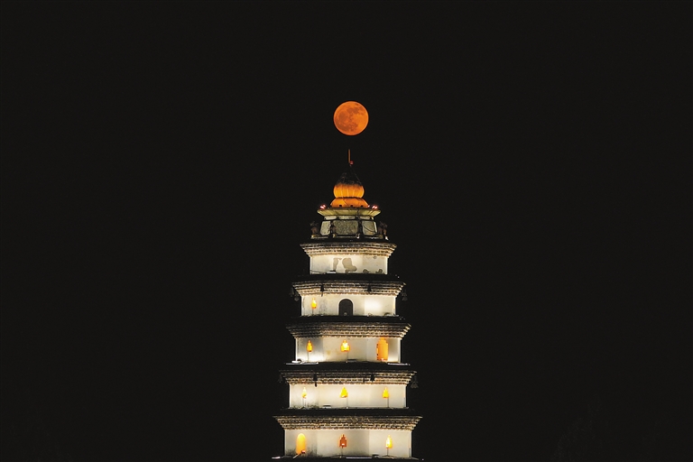 圖為6月11日在四川省閬中市拍攝的懸掛在明代白塔塔尖的滿月(無人機照片)。新華社發(fā)