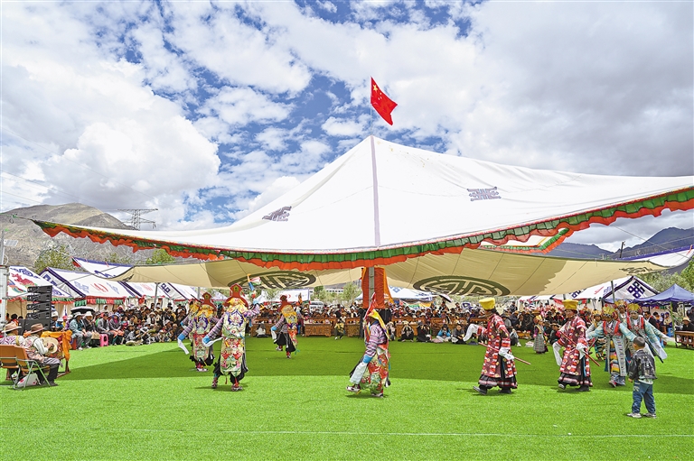 圖為7月16日,民間藏戲表演隊在南木林縣非遺公園內表演湘巴藏戲。新華社記者 李鑫 攝