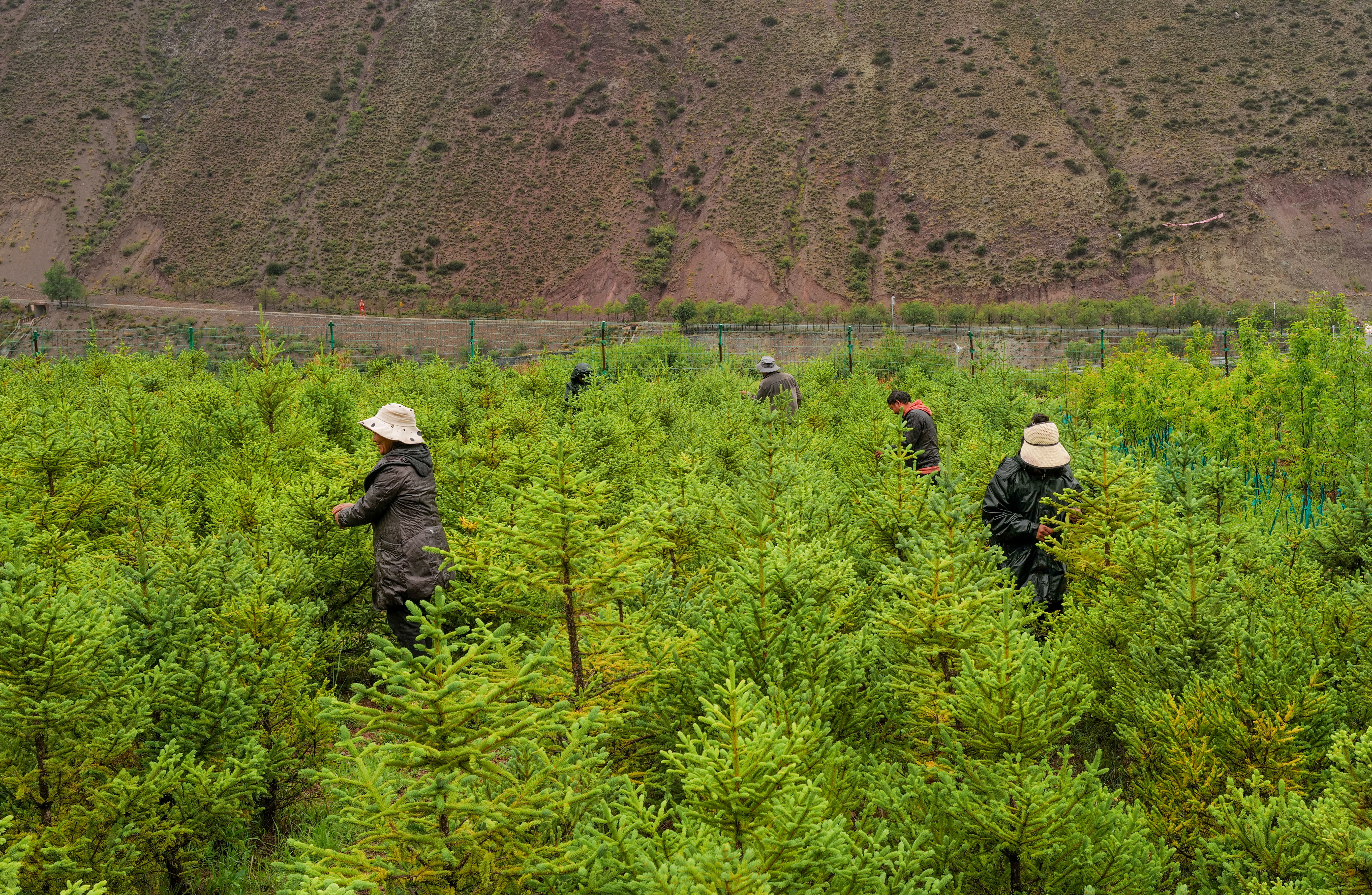 圖為昌都市林業(yè)有限公司如給苗圃的工作人員在查看苗木長(zhǎng)勢(shì)。 記者 丹增群培 攝