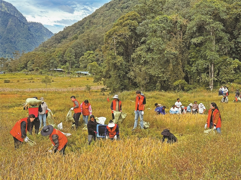 為解決部分農(nóng)戶勞動力短缺、秋收進(jìn)度慢的難題,林芝市墨脫縣格當(dāng)鄉(xiāng)黨委政府組織黨員干部開展“助農(nóng)秋收”志愿服務(wù)活動。