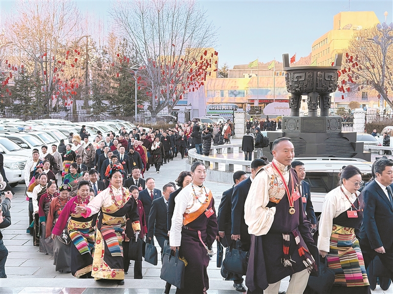身著民族服飾的自治區人大代表步入會場。記者 次旦央吉 攝