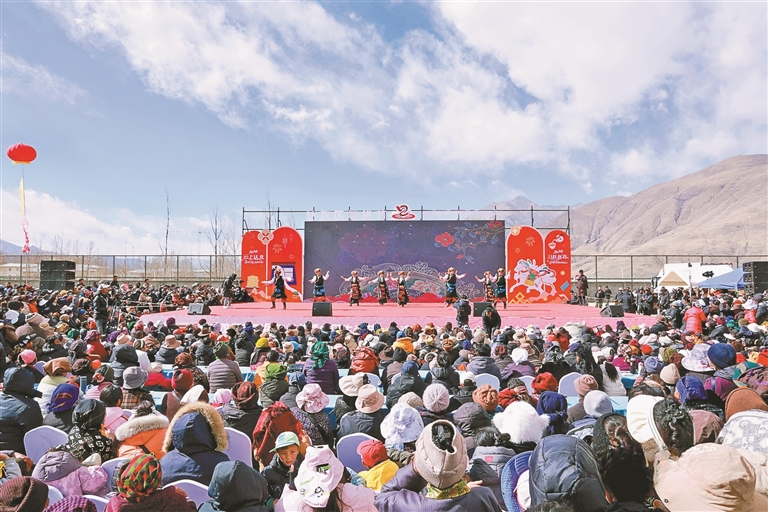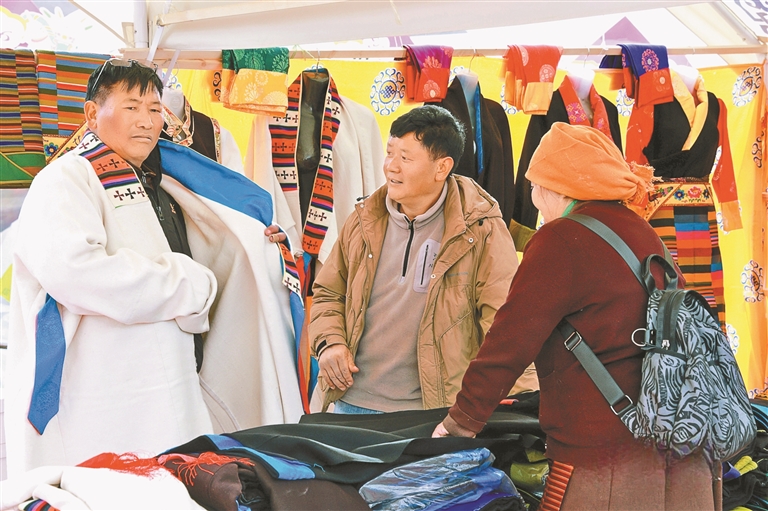 來自達孜區邦堆鄉的普珍阿佳,帶著自家以傳統方法釀制的青稞酒,吸引了不少新老主顧前來購買;“90后”創業者達瓦將藏式紋樣與現代設計相結合,制作出的新潮手機殼、帆布包,成為年輕人爭相選購的“尖貨”;書法家桌前排起長隊,他們或送春聯、或寫“福”字;藏戲、民歌表演的舞臺前更是掌聲不斷。