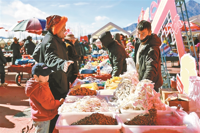 暮色降臨,年貨節的喧囂漸漸褪去,但仍有一種溫暖的氛圍彌漫:大爺大媽拉著小車滿載而歸,臉上洋溢著滿足的笑容;孩子們舉著新買的玩具風車奔跑嬉戲;久未見面的朋友在攤位前偶遇,寒暄著互贈剛買的年禮……“這不僅是在買東西,更是在‘準備’過年。大家一起逛著、挑著,年味一下子就濃了。”索朗多吉感慨道。
