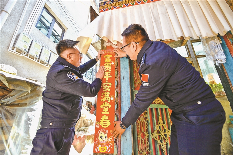 民警入戶慰問過程中,幫群眾貼對聯(lián)。本網(wǎng)記者 旦增嘎瓦 攝