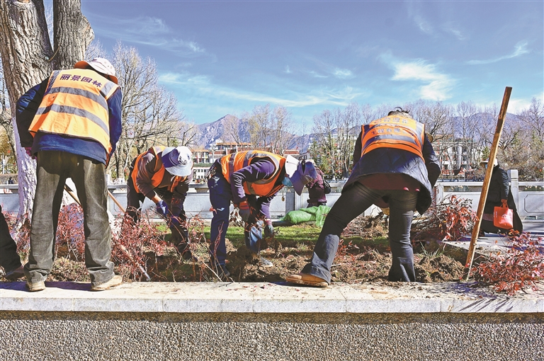 陽春三月,雪域高原春意漸濃。在拉薩市區(qū)的一處公園綠地內(nèi),園林工人們正搶抓春季綠化黃金期,開展苗木栽植作業(yè)。