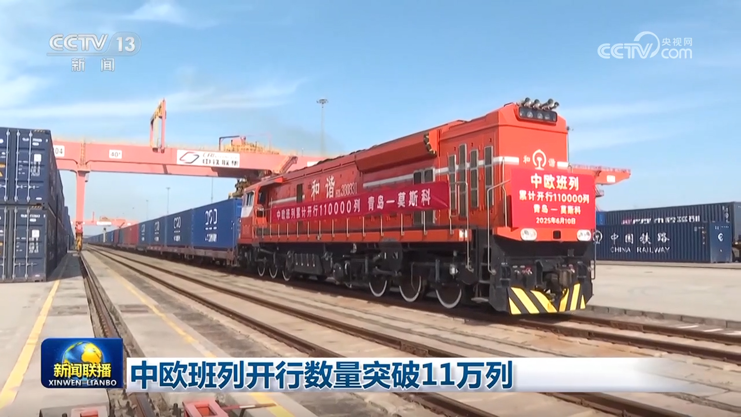 央視網消息(新聞聯播):6月10日上午,隨著75052次中歐班列從青島膠州站開出,中歐班列累計開行數量突破11萬列,貨值超4500億美元。