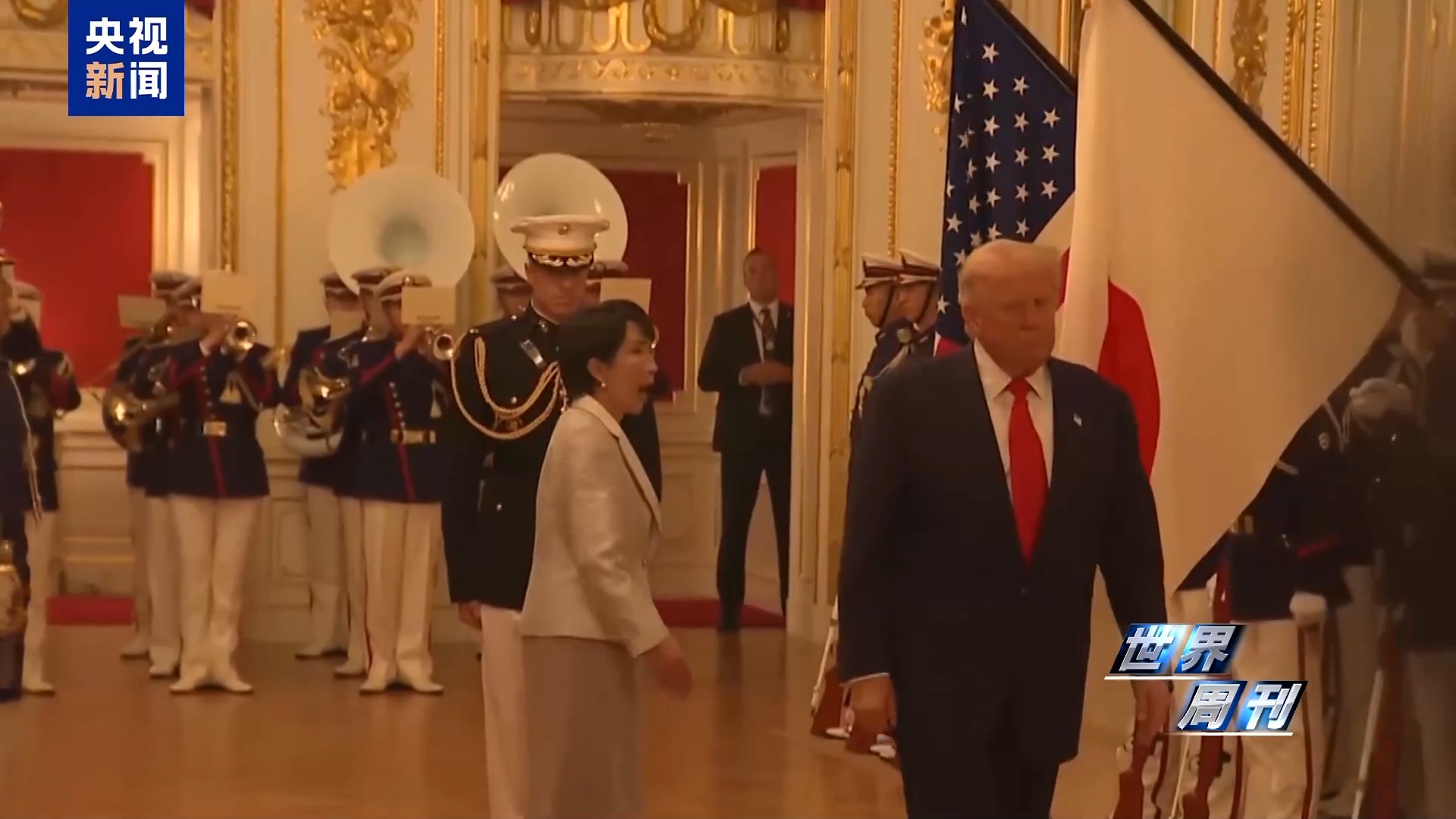 今年10月28日,美國總統特朗普與日本首相高市早苗在東京迎賓館赤坂離宮舉行會晤。在會晤前的致敬儀式上,當高市早苗指引特朗普向國旗敬禮時,特朗普似乎沒有領會高市早苗的意思,而是徑自走過日本國旗,令高市十分尷尬。
