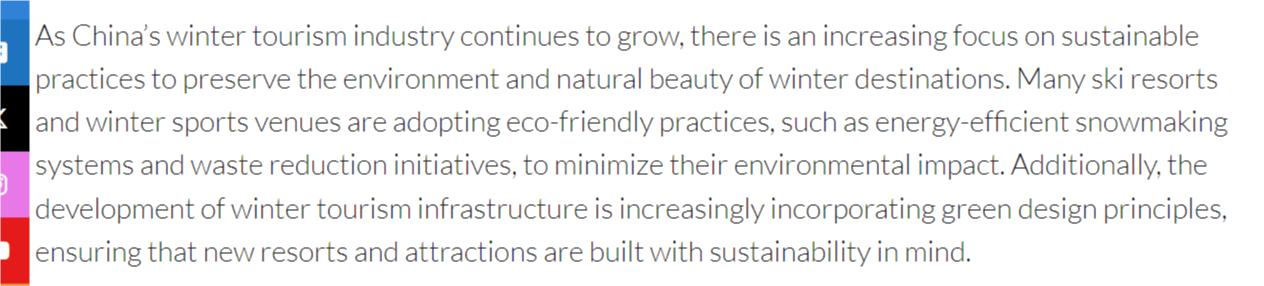 文章還說,隨著中國冬季旅游產(chǎn)業(yè)的不斷壯大,可持續(xù)發(fā)展理念、環(huán)保實(shí)踐也日益受到重視。中國正成為越來越有吸引力的冬季旅游目的地。