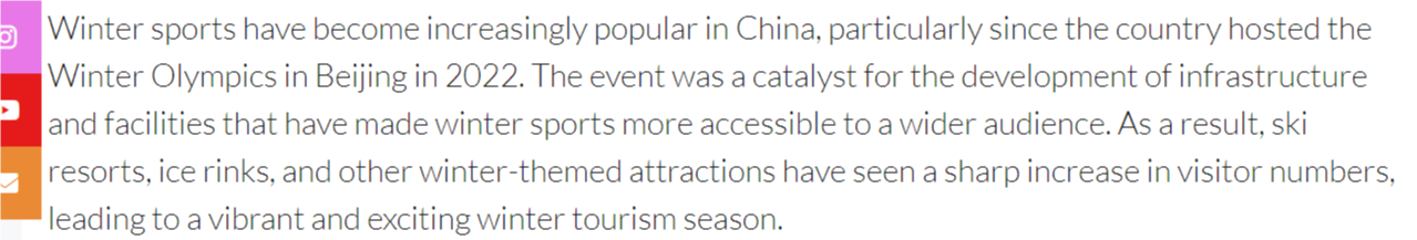 文章說,自2022年北京冬奧會(huì)成功舉辦以來,冰雪運(yùn)動(dòng)在中國越來越受歡迎。冬奧效應(yīng)帶動(dòng)了基礎(chǔ)設(shè)施的完善,讓更多人得以接觸冰雪項(xiàng)目。如今,滑雪場、冰場和其他冬季主題景點(diǎn)客流量大幅增長,造就了充滿活力、令人興奮的冰雪旅游季。