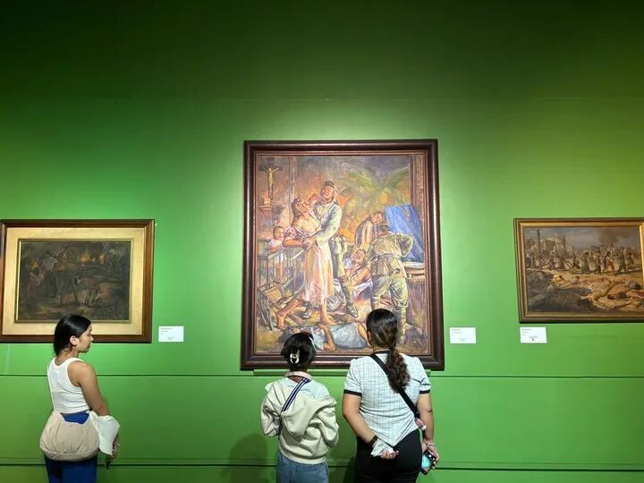參觀者在菲律賓國家美術館二戰主題展廳參觀,該展廳陳列著二十余幅描繪日軍暴行的畫作。(新華社記者 張怡晟 攝)