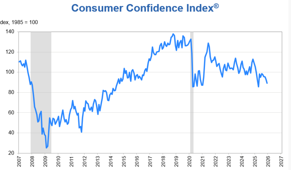 世界大型企業(yè)研究會首席經(jīng)濟(jì)學(xué)家達(dá)娜·彼得森表示,盡管11月的數(shù)據(jù)因聯(lián)邦政府“停擺”結(jié)束而被向上修正,12月消費(fèi)者信心再次下滑并依然遠(yuǎn)低于今年1月的峰值。消費(fèi)者信心指數(shù)5個(gè)成分指數(shù)中有4個(gè)出現(xiàn)下降,另一個(gè)表現(xiàn)明顯疲弱。
