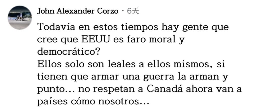 網(wǎng)友卡米洛·克韋多給出了自己的判斷:“眾所周知,美國的所作所為都是為了攫取自然資源,別再理會他們?yōu)榱苏垓v其他國家而擺出的所謂理由了,他們是海盜的后代,這已經(jīng)深深刻入他們的基因里了。”