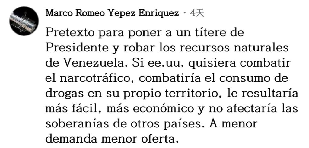 網(wǎng)友馬爾科·耶佩斯直言不諱:“所有一切不過是美國安插傀儡以掠奪委內(nèi)瑞拉自然資源的借口罷了。如果美國真想打擊販毒,就應(yīng)該去打擊自己領(lǐng)土上的毒品消費,這樣更簡單、更經(jīng)濟,也不會影響其他國家的主權(quán),需求減少供應(yīng)自然也會下降。”