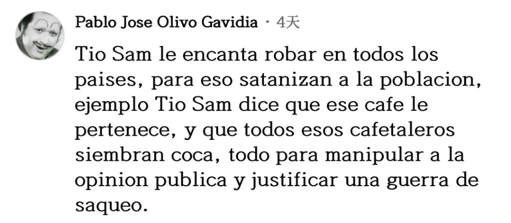 網(wǎng)友巴勃羅·奧利沃留言說:“山姆大叔喜歡在所有國家盜竊,為此他們妖魔化民眾,譬如山姆大叔說那片咖啡園是屬于他的,還說所有那些咖啡農(nóng)在種植古柯,所有這一切都是為了操弄輿論,為了給他們的掠奪戰(zhàn)爭辯護。”
