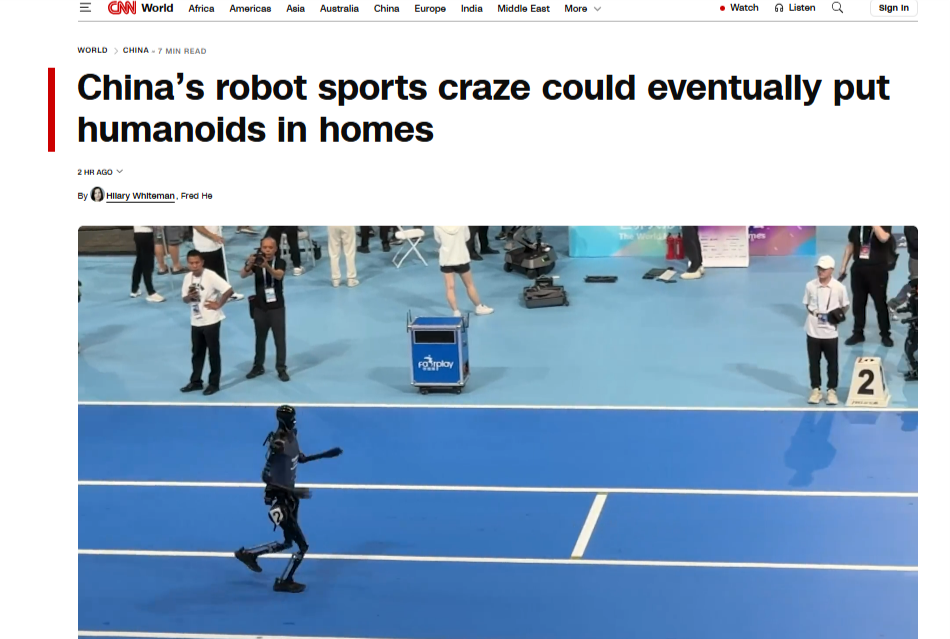 文章說,2015年以來,中國機器人產業加速發展。根據中國國內的權威數據,目前中國已擁有150多家人形機器人公司,且數量持續增長。對于許多機器人企業來說,體育已成為一個展示產品能力和探索應用途徑的試驗場。正是在這樣的背景下,2025 年中國機器人體育賽事激增:人形機器人不僅登上春晚舞臺,完成了半程馬拉松比賽,北京還舉辦了世界上首屆人形機器人運動會 ,在多項體育項目中考驗了機器人的能力。文章指出,以足球等為代表的體育項目一直被科學家認為是測試機器人的標準項目。機器人足球需要許多“基本能力”,包括運動、視覺、定位、協作戰略規劃和對抗推理。