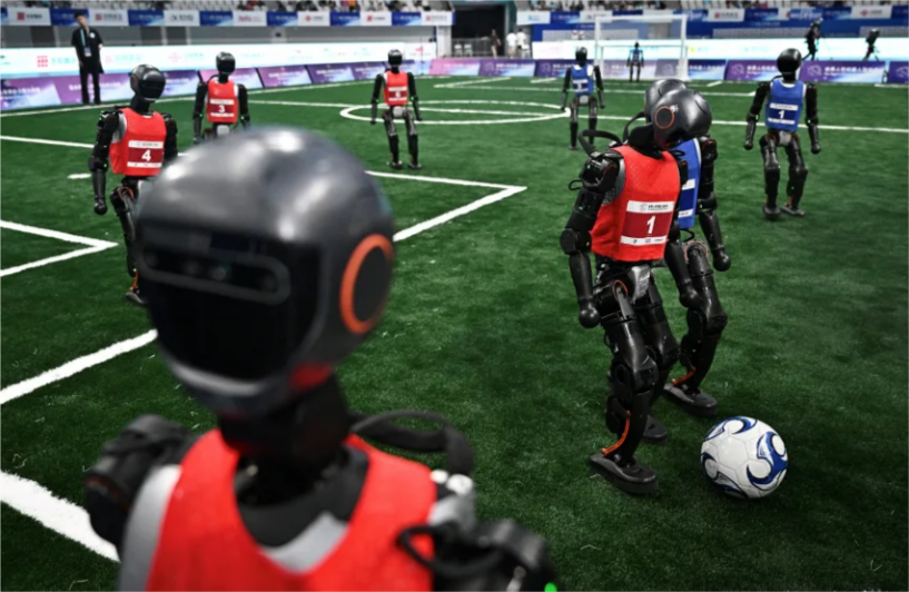 2025年8 月,在北京舉辦的首屆人形機器人運動會上,機器人“選手”們正參與“五人制”足球比賽?!。▓D源:路透社)