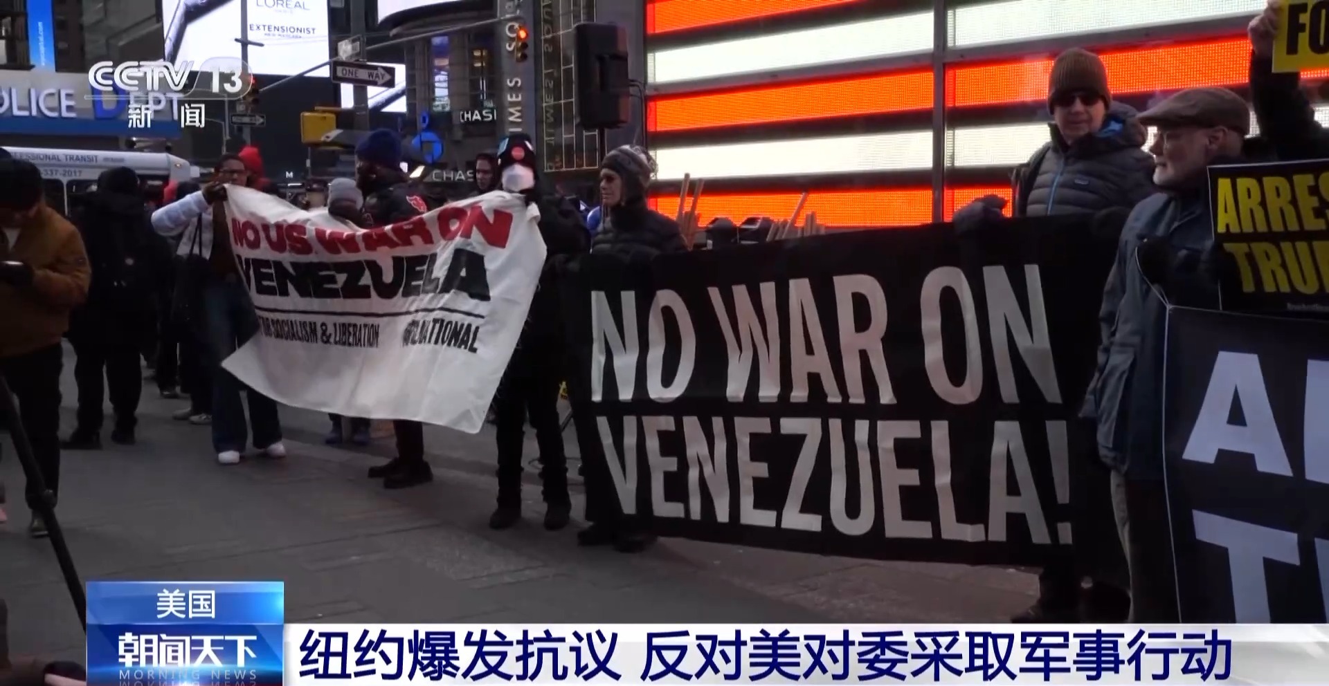 在美國對委內瑞拉采取軍事行動后,當地時間1月3日,美國紐約時報廣場爆發抗議活動。部分民眾走上街頭,反對美方對委內瑞拉采取軍事行動。