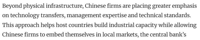 文章表示,在共建“一帶一路”倡議推出初期,中國(guó)對(duì)外投資主要集中于單一的基礎(chǔ)設(shè)施項(xiàng)目。近年來(lái),投資重點(diǎn)逐漸轉(zhuǎn)向綠色能源和電信等高附加值領(lǐng)域的本土化布局。文章援引相關(guān)分析報(bào)告說(shuō),如今,中國(guó)海外投資普遍采用“鏈?zhǔn)睫D(zhuǎn)移”模式——上下游企業(yè)共同搬遷至東道國(guó),在當(dāng)?shù)亟⑼暾漠a(chǎn)業(yè)集群。