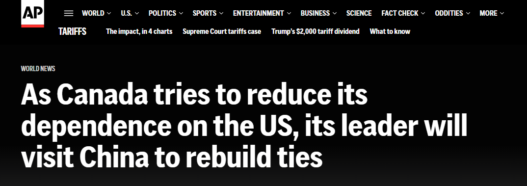 1月14日至17日,加拿大總理卡尼對中國進行正式訪問。多家外媒指出,這是加拿大總理近十年來首次訪華,不僅釋放出加方希望改善并深化對華關系的明確信號,也凸顯出在全球不確定性加劇的背景下,中國正成為越來越多國家的合作伙伴。