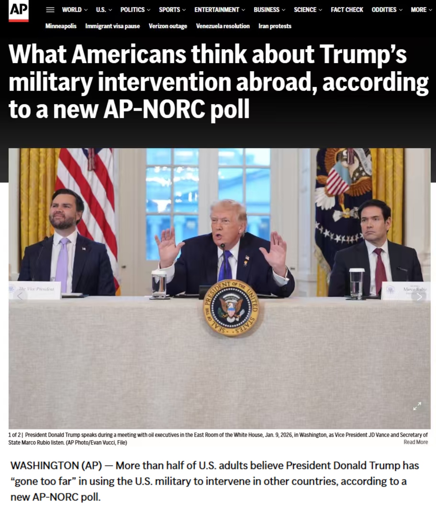 美聯社近日刊文稱,美聯社-NORC公共事務研究中心最新民意調查顯示,56%的美國成年人認為,美國政府在動用軍隊干預他國的問題上“太過火”,同時多數人對美國政府的整體外交政策及在委內瑞拉問題上的處理方式持否定態度。
