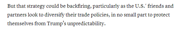 文章稱,近來這種重新調(diào)整加快了步伐。自新年以來,各方展開了一系列外交和貿(mào)易談判,但這些談判均不涉及美國。以歐盟為例,不僅與南方共同市場的貿(mào)易協(xié)定取得了進展,還與印度簽署了期待已久的自由貿(mào)易協(xié)定。