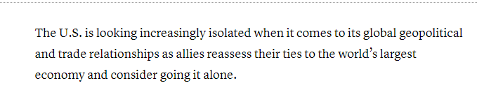 美國消費者新聞與商業(yè)頻道(CNBC)1月31日刊文稱:隨著盟友重新評估與世界最大經(jīng)濟體(美國)的關(guān)系并考慮“單干”,美國在全球地緣政治和貿(mào)易關(guān)系中將顯得日益孤立。