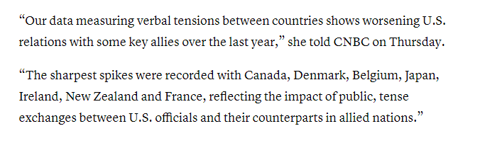 文章援引全球風(fēng)險和戰(zhàn)略咨詢公司Verisk Maplecroft首席分析師希梅納·布蘭科(Jimena Blanco) 的話說,美國與其盟友間的溝通方式出現(xiàn)了明顯的惡化。布蘭科指出,“過去一年里,美國與一些主要盟友的關(guān)系惡化了”,其中與加拿大、丹麥、比利時、日本、愛爾蘭、新西蘭和法國的波動最為劇烈,“這反映出美國與盟友間公開、緊張的交流所造成的影響。”