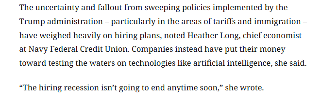 報道還援引美國海軍聯邦信用合作社(Navy Federal Credit Union)首席經濟學家希瑟·朗的觀點稱,特朗普政府推行的一系列政策,尤其是關稅和移民政策,所帶來的不確定性及后果對招聘計劃造成了沉重影響。希瑟·朗認為,招聘市場的低迷狀況短期內不會結束。