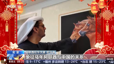 阿聯(lián)酋駐華大使 哈馬迪:這幅畫里的這兩匹馬,象征馬年阿聯(lián)酋與中國的關(guān)系,這匹是阿拉伯馬,這匹是中國馬,共同前進(jìn)。