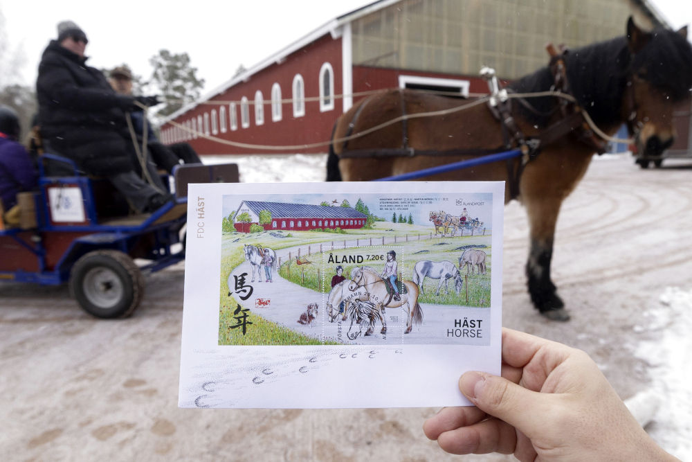 在馬年郵票“小型張”畫面上,芳草萋萋,野花盛開,數匹駿馬參差排布,或低頭吃草,或拉車而行,或與人親昵;稍遠處,紅墻青瓦的房舍掩映于綠樹之間,一派別具奧蘭群島特色的田園景象。