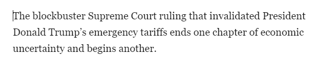 當地時間2月21日,美國《華盛頓郵報》發文稱,美最高法院近日裁決美政府緊急關稅政策無效,這結束了一個經濟不確定性的“篇章”,同時也開啟了另一個不確定性的“篇章”。
