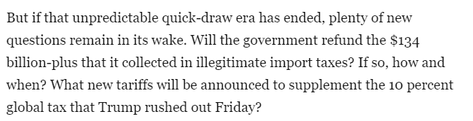 最高法院的這項裁決終結了一年多來總統“自由行事”的局面。但隨之而來的還有許多新問題。政府是否會退還其非法征收的超過1340億美元的進口稅?如果會,將如何退還?何時退還?除了新推出的加征全球關稅之外,還會宣布哪些新的關稅措施?