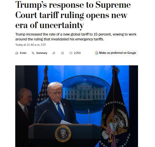中新網2月22日電 當地時間2月21日,美國《華盛頓郵報》發文稱,美最高法院近日裁決美政府緊急關稅政策無效,這結束了一個“經濟不確定性的篇章”,同時也開啟了“另一個不確定性的篇章”。