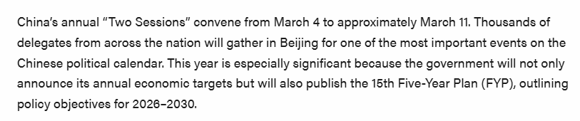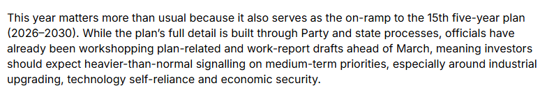 文章說,今年的兩會尤為關鍵,將為第十五個五年規劃(2026-2030年)奠定基礎。投資者應關注比往年更明確的政策信號,特別是在產業升級、科技自主和經濟安全等領域。