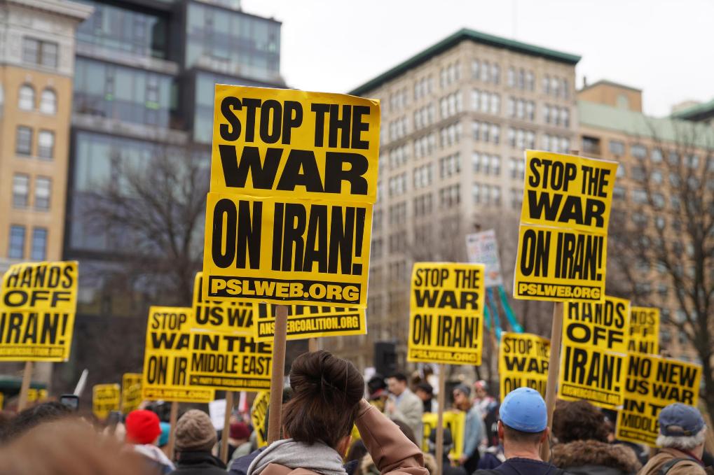 3月7日,人們在美國紐約參加集會游行,抗議美國和以色列對伊朗發動軍事打擊。新華社記者張鳳國攝