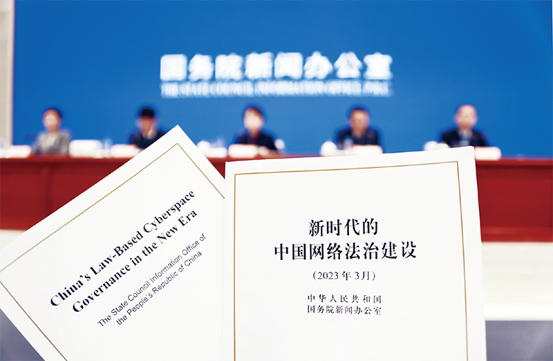 2023年3月16日,國務院新聞辦公室在北京發布《新時代的中國網絡法治建設》白皮書,并舉行新聞發布會。圖為當日拍攝的白皮書。 新華社記者 潘旭/攝