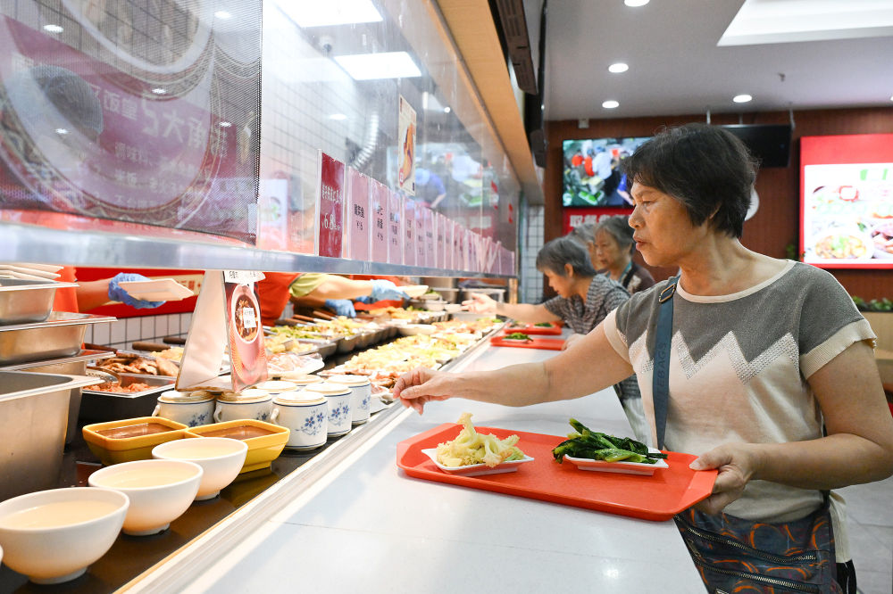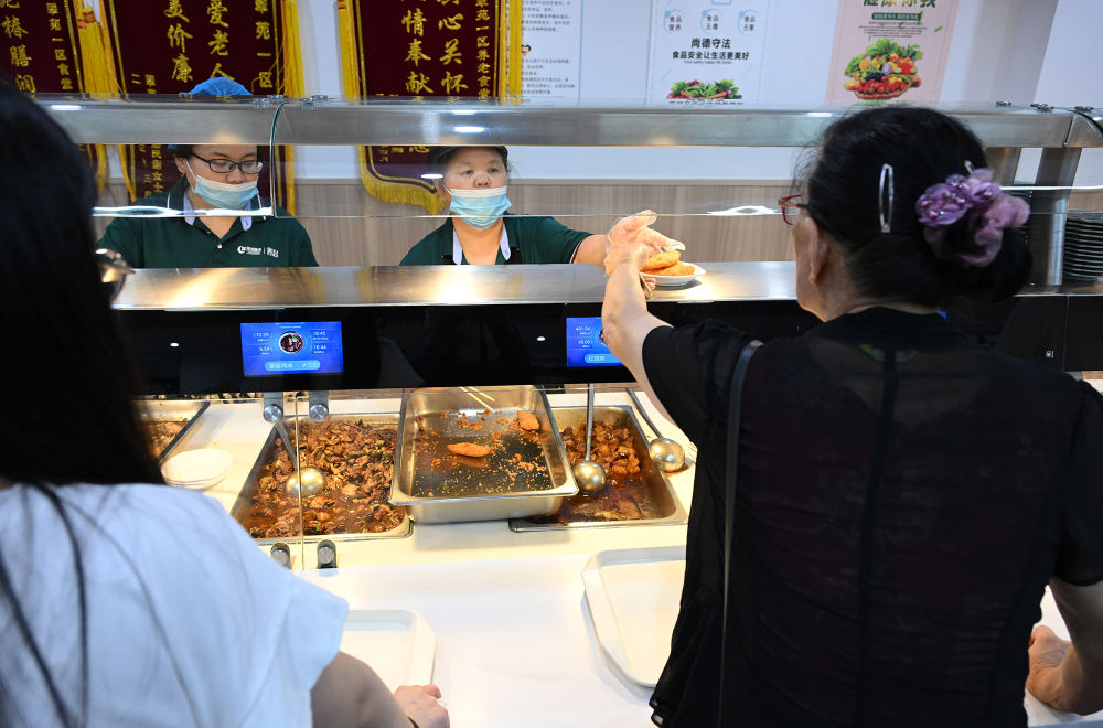 老人正在杭州翠苑一區老年食堂挑選餐品(7月25日攝)。新華社記者 李賀 攝