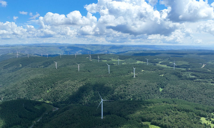 這是河北省圍場滿族蒙古族自治縣御道口鎮附近的風電場(2024年7月26日攝,無人機照片)。新華社發(梁子棟攝)