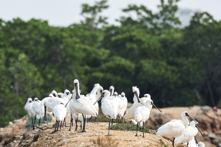 一群黑臉琵鷺在海南新盈紅樹林國家濕地公園休憩(2023年12月27日攝)。新華社記者 張麗蕓 攝