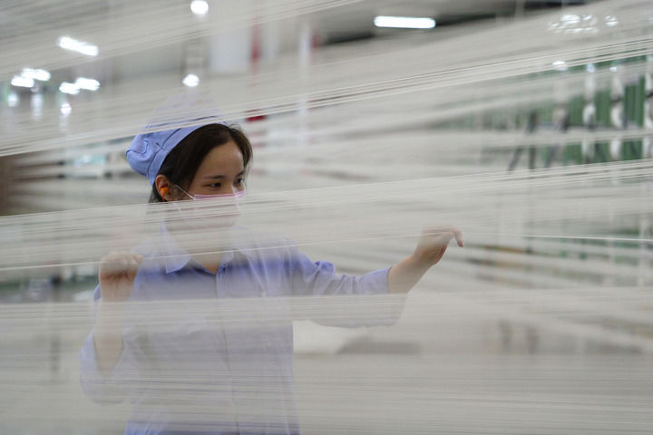 工作人員在位于河南省平頂山市的中國平煤神馬集團簾子布發展公司布機車間檢查絲線情況(2024年3月28日攝)。中國平煤神馬集團積極延伸煤炭產業鏈,普通的煤炭被加工成眾多高附加值衍生產品。新華社記者 李嘉南 攝