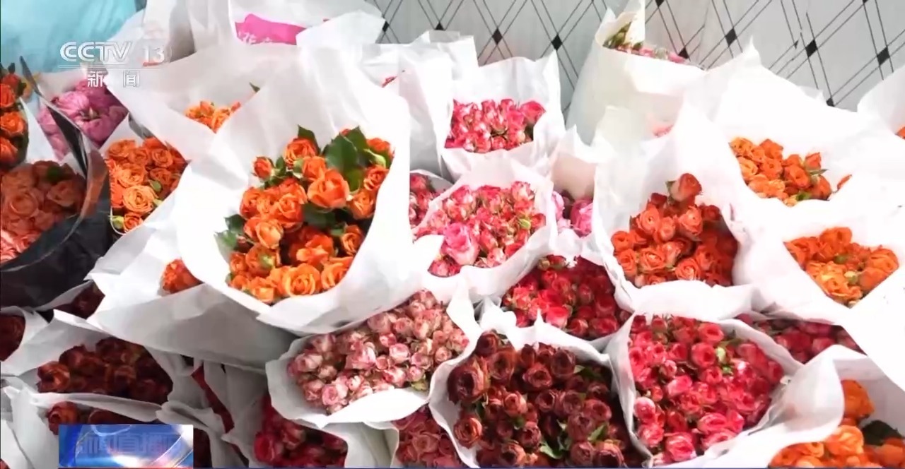 除了花卉市場,花店的生意也火熱起來。這家店里擺滿了玫瑰、康乃馨,巧妙的搭配,創意的造型,營造出新年的氛圍,銷售量也大幅上漲。