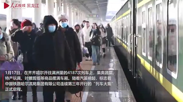 人民網哈爾濱1月18日電 (徐成龍、尚城)1月17日,在齊齊哈爾開往滿洲里的4187次列車上,果類蔬菜、特產玩具、葉雕剪紙等商品擺滿車廂。隨著汽笛響起,標志著中國鐵路哈爾濱局集團有限公司連續第三年開行的“列車大集”正式啟程。