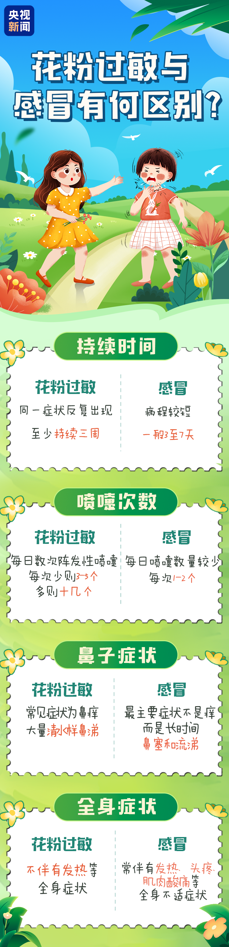 流鼻涕、鼻塞、打噴嚏既是感冒癥狀,也是過敏癥狀。花粉過敏和感冒有何不同?一圖了解↓