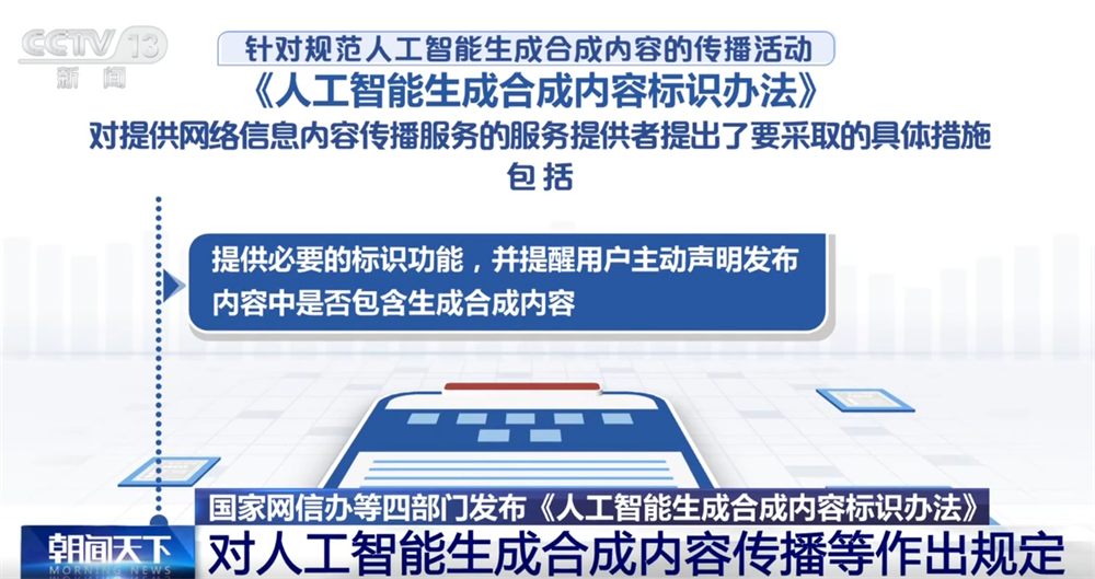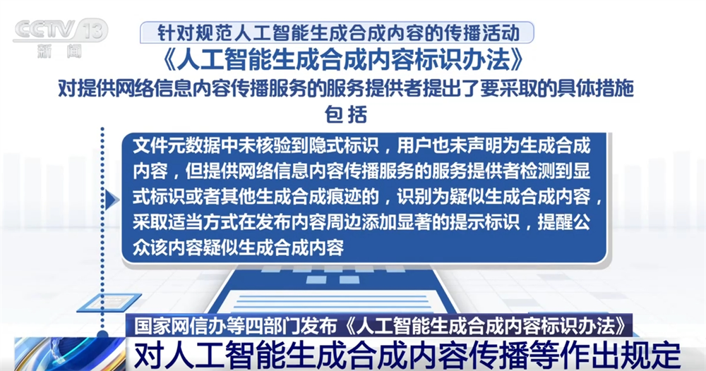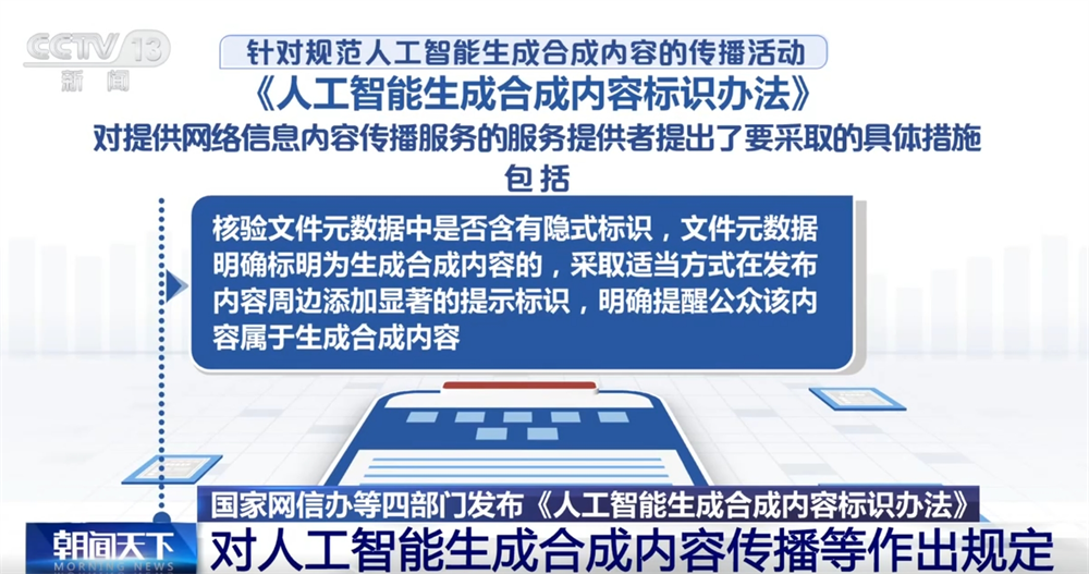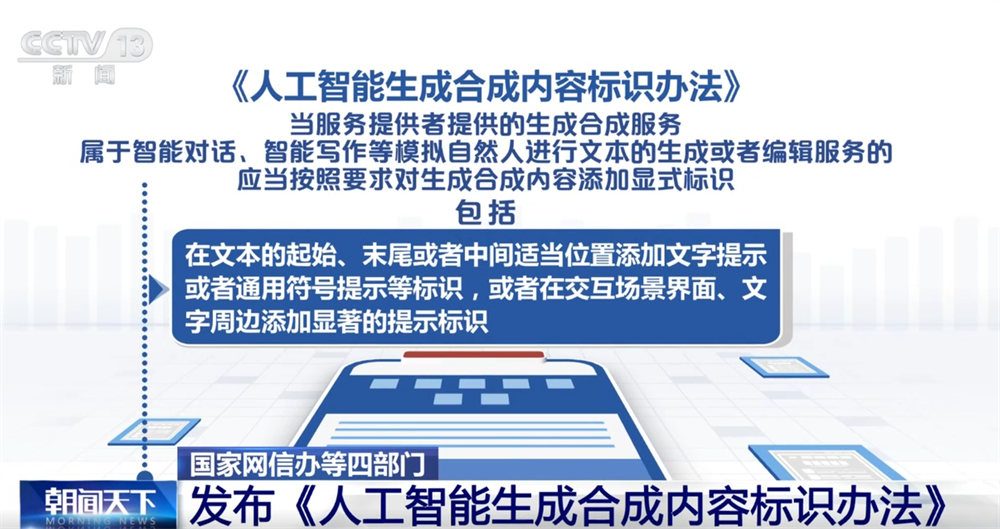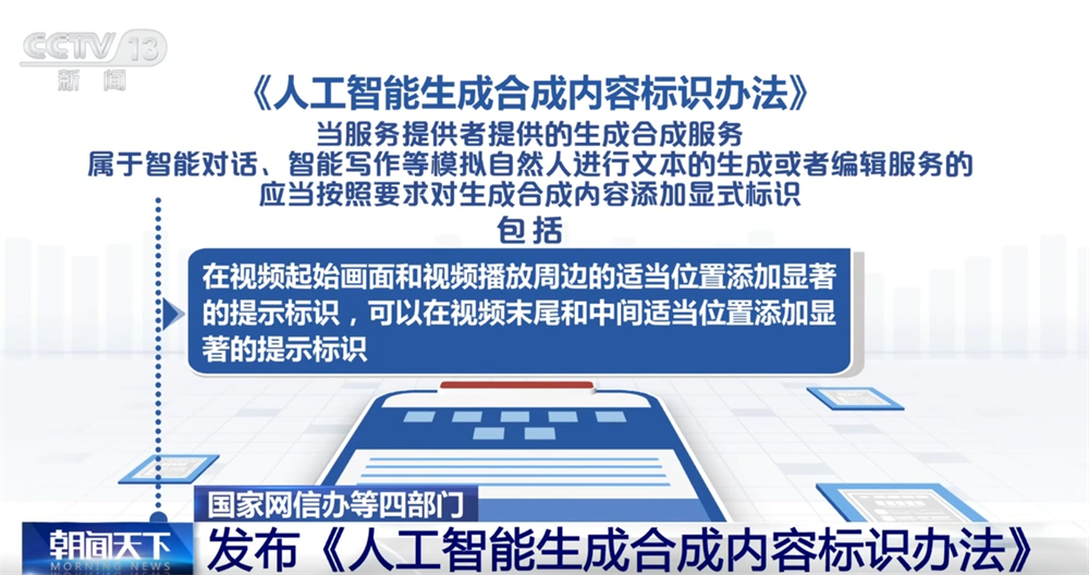 央視網(wǎng)消息:記者14日從國家網(wǎng)信辦獲悉,為了促進人工智能健康發(fā)展,規(guī)范人工智能生成合成內(nèi)容標識,國家網(wǎng)信辦、工業(yè)和信息化部、公安部、國家廣播電視總局制定了《人工智能生成合成內(nèi)容標識辦法》?!稑俗R辦法》將于2025年9月1日起施行。